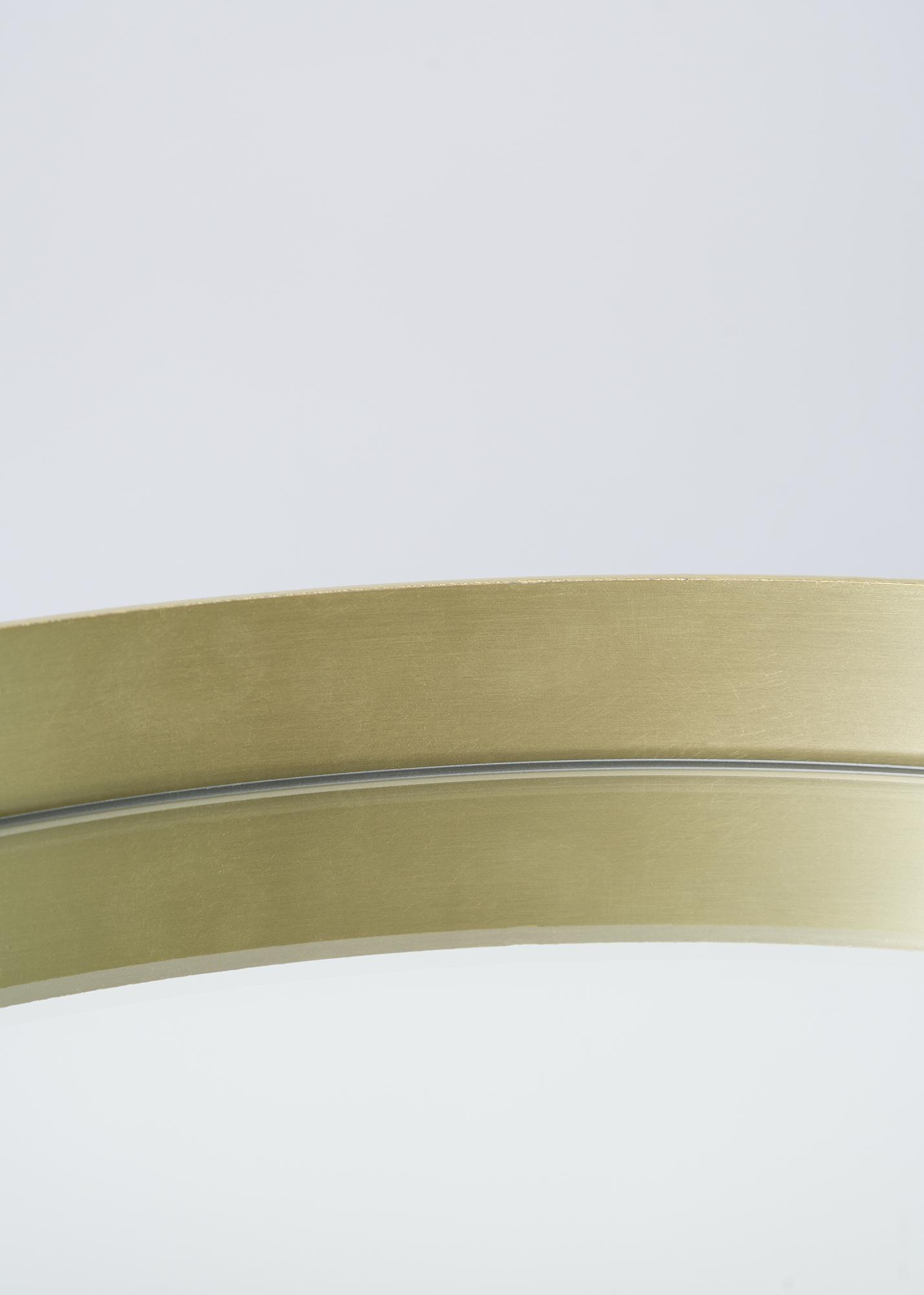 En ronde wandspiegel met een uitnodigend en exclusief gevoel. De spiegel is omringd door een messing gekleurde metalen frame. Het frame is een dunne en stijlvolle lijst met een paar centimeter hoge kant die een smaakvol effect geeft aan de gehele spiegel.