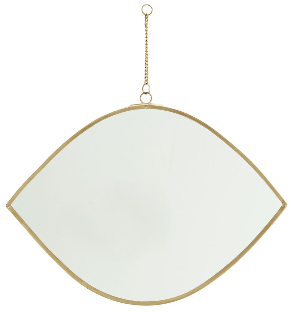Laat deze mooie spiegel van Madam Stoltz een opvallend interieurdetail zijn in je huis. De speciale vorm lijkt op een oog, wat deze wandspiegel samen met de messingkleurige lijst zeer elegant maakt. De spiegel wordt opgehangen aan een fijne ketting, wat het gevoel van elegantie extra versterkt. Dit spiegelmodel is verkrijgbaar in twee verschillende afmetingen en deze spiegel heeft een lengte van 26 cm. De kleine afmeting zorgt dat de spiegel erg mooi te matchen is met andere spiegelmodellen.