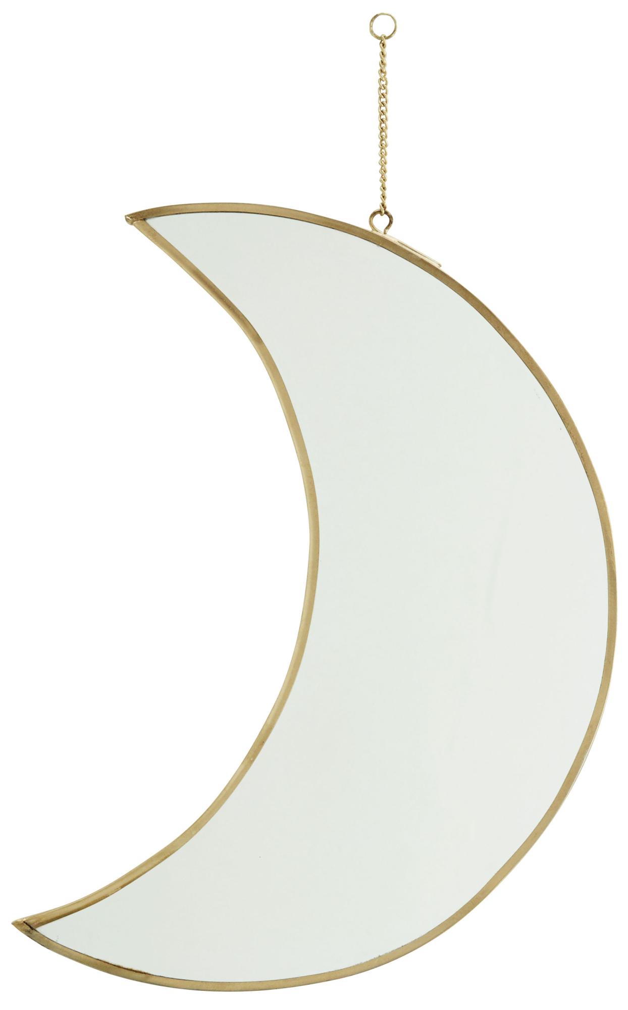 Laat deze mooie spiegel van Madam Stoltz een opvallend interieurdetail zijn in je huis. De speciale vorm lijkt op een maan, wat deze wandspiegel samen met de messingkleurige lijst zeer elegant maakt. De spiegel wordt opgehangen aan een fijne ketting, wat het gevoel van elegantie extra versterkt. Dit spiegelmodel is verkrijgbaar in twee verschillende afmetingen en deze spiegel heeft een hoogte van 30 cm. De kleine afmeting zorgt dat de spiegel erg mooi te matchen is met andere spiegelmodellen.