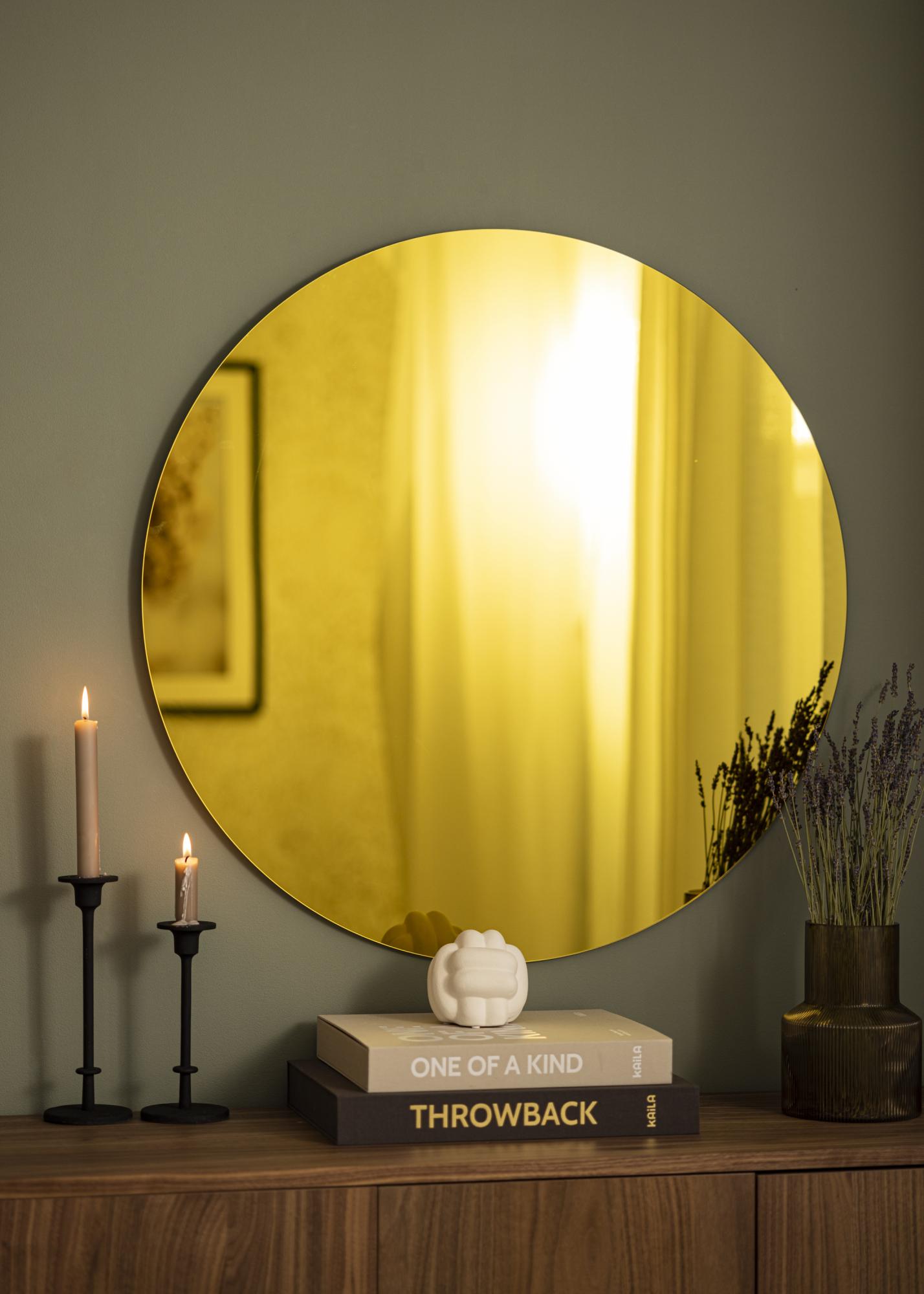 Deze trendy ronde spiegel zal een opvallend decoratief detail in je huis vormen. Of je de spiegel nu in je slaapkamer, hal of woonkamer plaatst, het geel getinte spiegelglas geeft de hele kamer een vleugje kleur op een manier die zowel verfijnd als aangenaam aanvoelt. De spiegel heeft dun spiegelglas en een ontwerp zonder frame, wat een minimalistische touch geeft. Aan de achterkant zit wandbevestiging om de spiegel aan de muur te kunnen bevestigen.