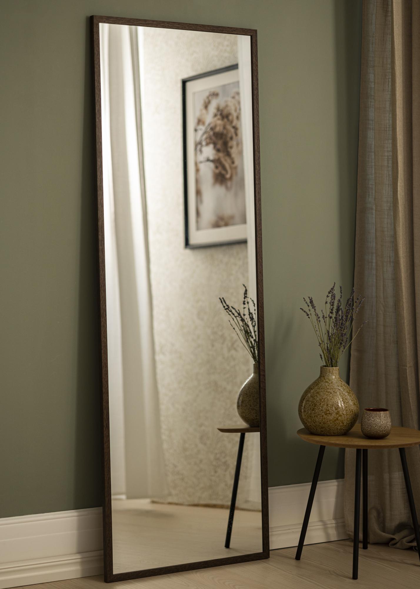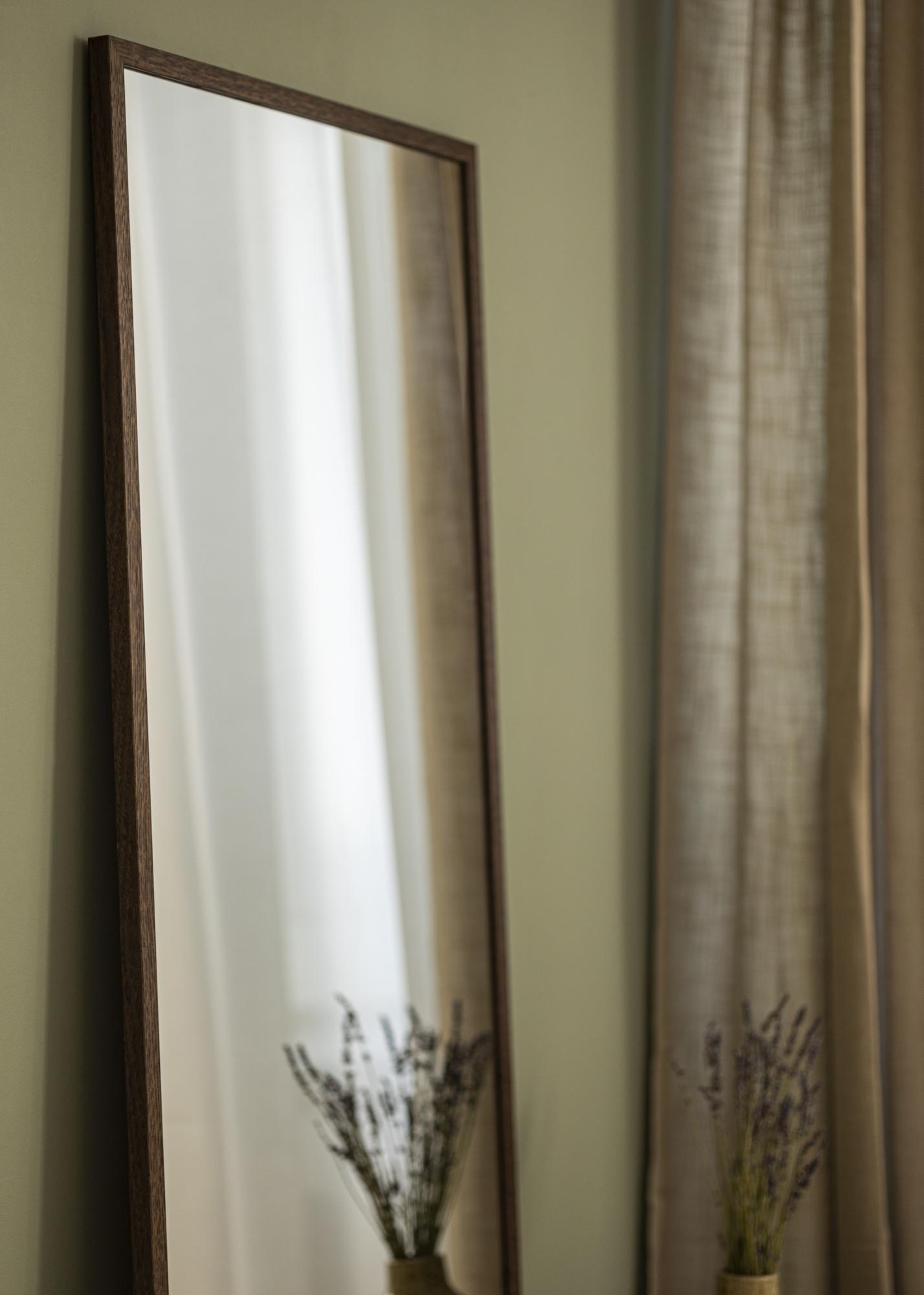 De spiegel is voorzien van een frame gemaakt van echt eikenhout en heeft een diepe donkere eiken tint die meteen de aandacht trekt. Het dikke frame geeft een robuust gevoel en draagt bij aan de algehele solide constructie van de spiegel. Deze spiegel is niet alleen een praktische toevoeging, maar ook een kunstwerk dat past bij verschillende interieurstijlen, van traditioneel tot modern.