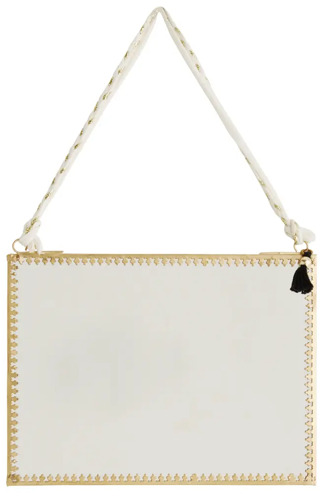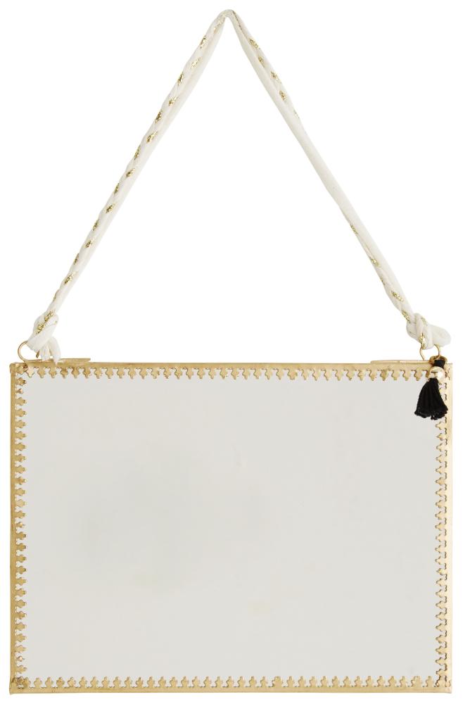 Mooie spiegel van Madam Stoltz, die een mooi detail is voor in elke kamer in huis. De spiegel heeft een elegant gevormde gouden lijst en decoratief kwastje bij één hoek. Het ophangkoord is van katoen, wat de spiegel een Boheems gevoel geeft. De wandspiegel heeft een afmeting van 20x15 cm en dit fijne formaat zorgt ervoor dat de spiegel erg mooi is om te matchen met andere spiegelmodellen. De spiegel is met de hand gemaakt, waardoor elk artikel iets kan verschillen in uiterlijk.