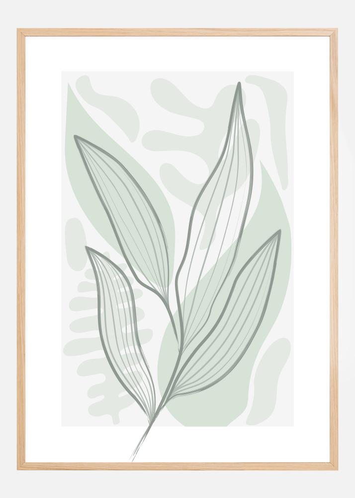 Een abstracte poster van bladeren op een eenvoudige groene achtergrond met verschillende bladvormen en -ontwerpen. Door het gebruik van zachte groene en grijze tinten geeft het eenvoudige bladontwerp, omlijnd met een sterke grijze lijn, krachtige lentekleuren af. Perfecte poster voor een zacht gevoel dat in elke kamer van het huis kan worden aangebracht.