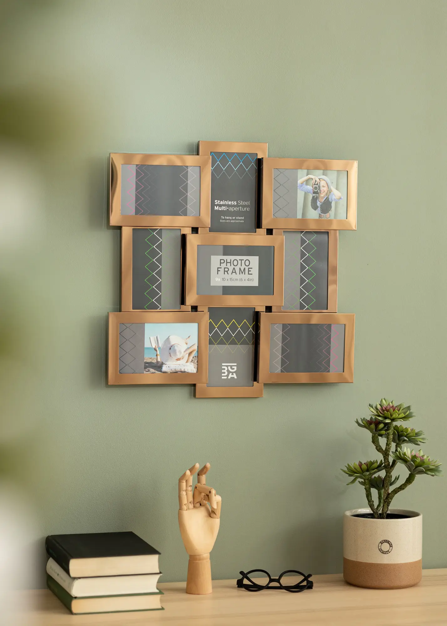 In dit collagekader passen 9 van je mooiste foto's in het formaat 10x15 cm. Het kader is gemaakt van metaal en heeft een mooie roségouden kleur. Het roestvrijstalen materiaal geeft het kader een moderne metallic look, die kan dienen als contrast met traditionele afbeeldingen of die het gevoel van abstracte prints kan versterken. Het metalen collagekader heeft handige wandbevestiging aan de achterkant en wordt staand aan de muur opgehangen.