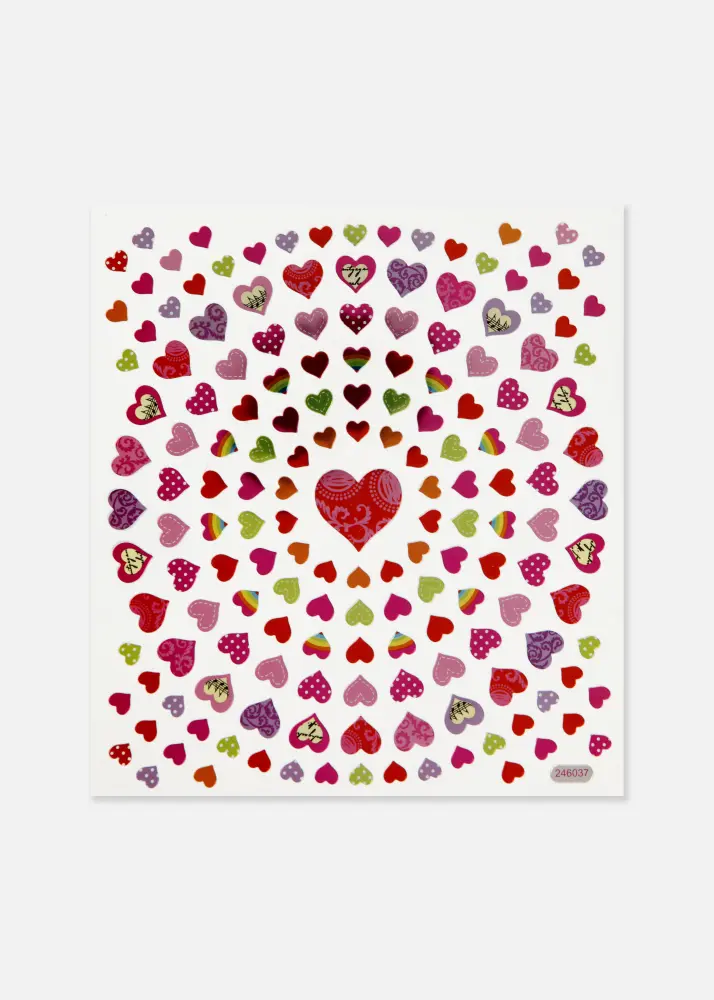 Geef je spullen een boost met onze zelfklevende stickers in de vorm van kleine hartjes! Deze stickers komen met mooie glitterdetails die je spullen snel en gemakkelijk omtoveren tot iets extra speciaals. Elk vel meet 15x16,5 cm en bevat een heel aantal hartjes in verschillende groottes.