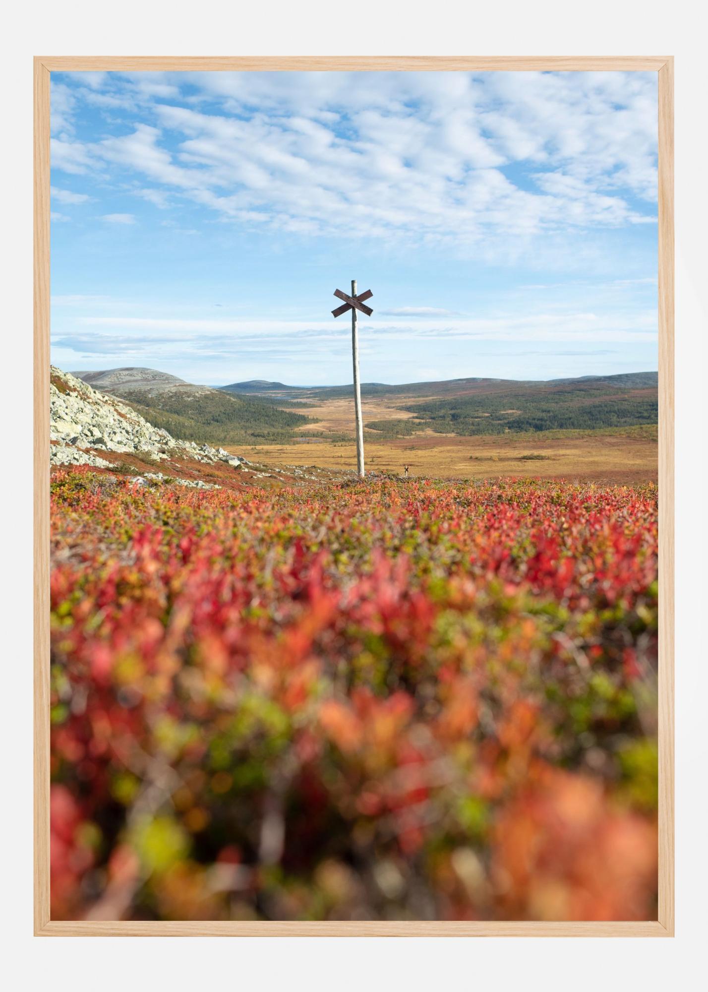 Deze sfeervolle poster toont een uitgestrekt berglandschap met een eenzaam houten kruis als blikvanger midden in de natuur. Het motief vangt het gevoel van rust, vrijheid en Scandinavische wildernis, waarbij je blik wordt geleid over open vlaktes en zacht glooiende heuvels. Een perfecte affiche voor wie houdt van natuurfoto’s, bergen, wandelen en Scandinavische esthetiek, en die een harmonisch en aards gevoel in huis wil creëren.