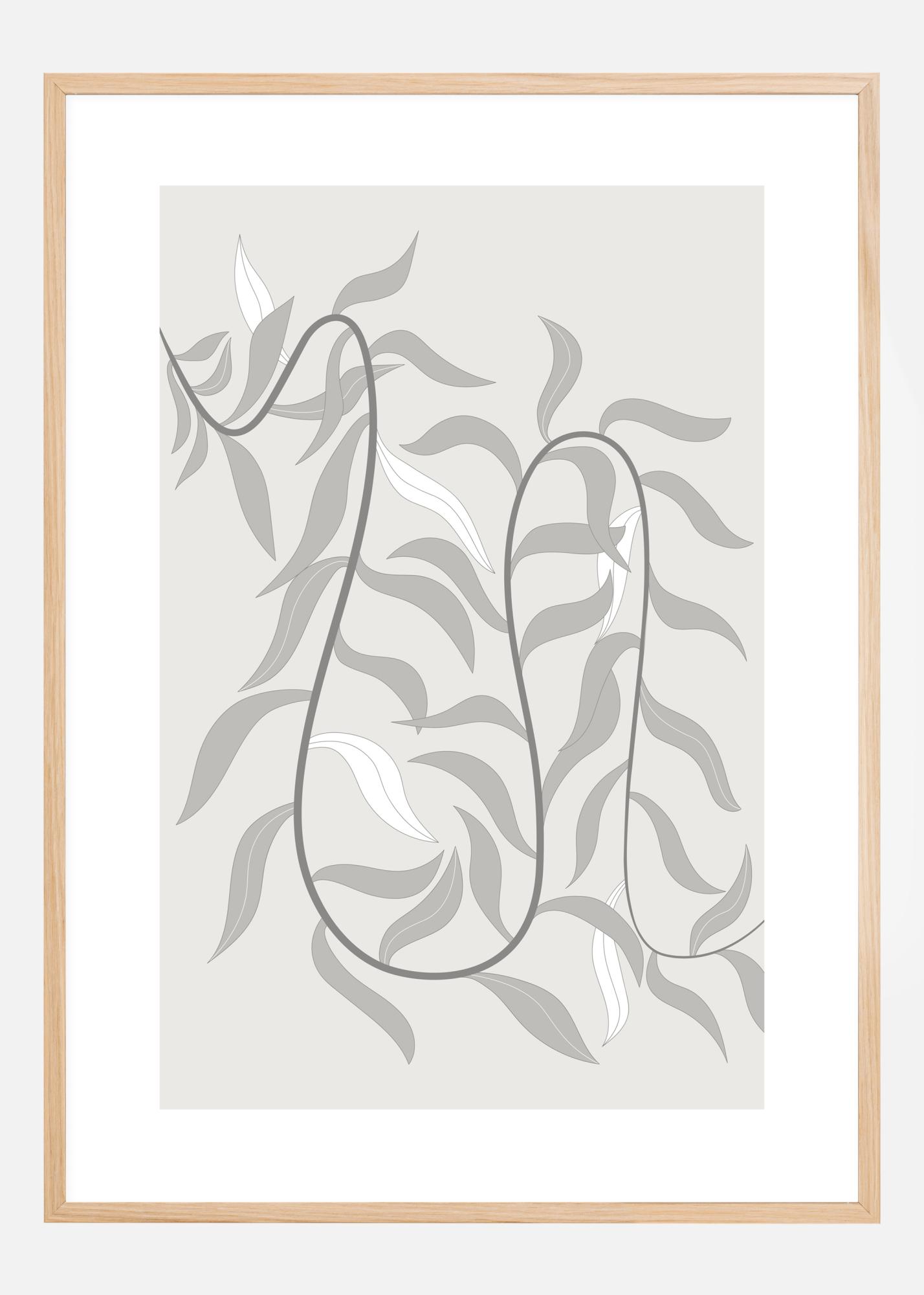 Een abstracte botanische poster van een kruipende wijnrank die zich een weg kronkelt over de poster. Het ontwerp is een eenvoudige stijl met de bladeren in lichtgrijs en wit. Een donkergrijze liaan kronkelt zich een weg tussen de bladeren door en voegt alles samen in één kronkelende vorm. Combineer deze poster met een zachtgroene muur voor een bladereffect.