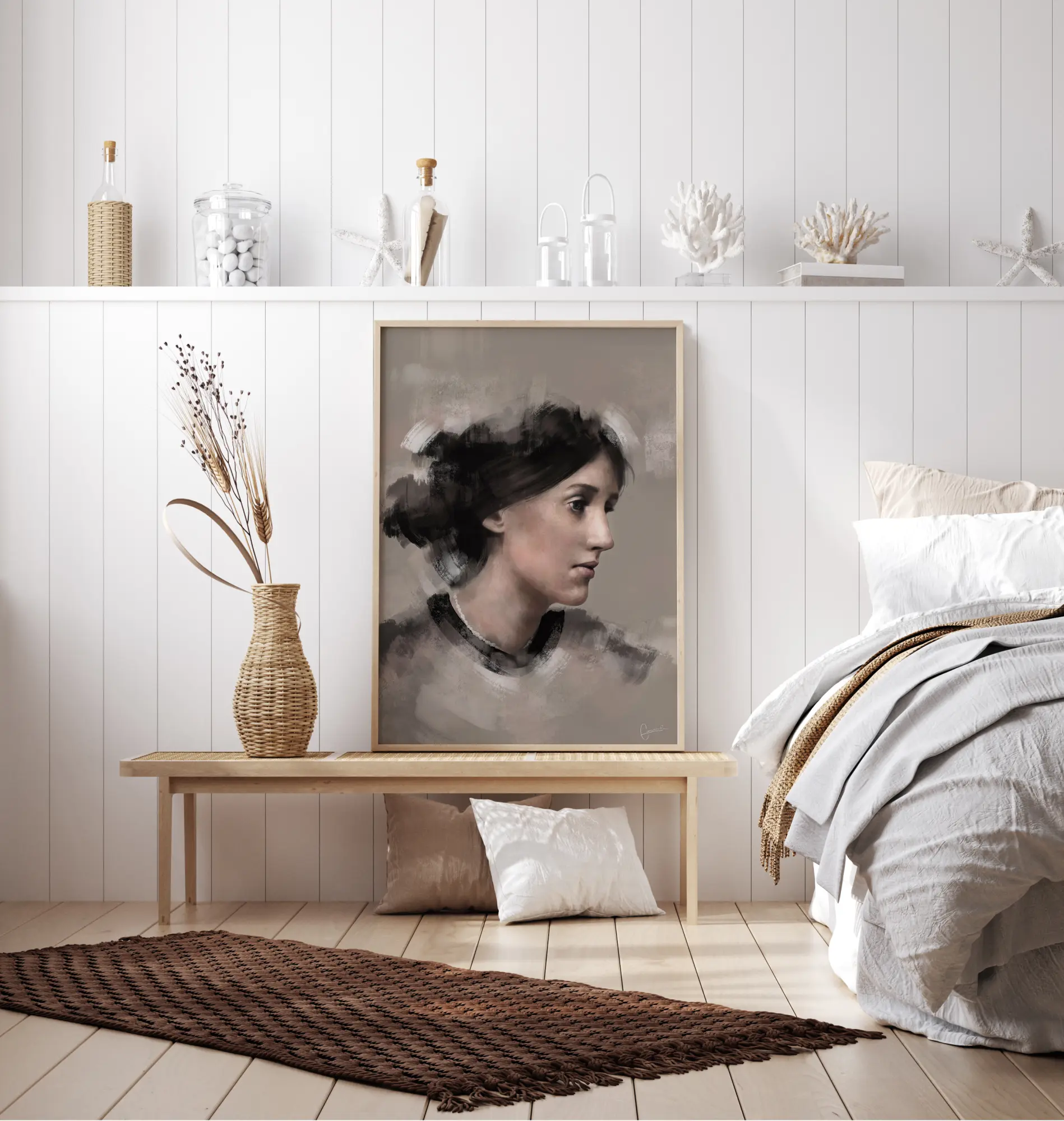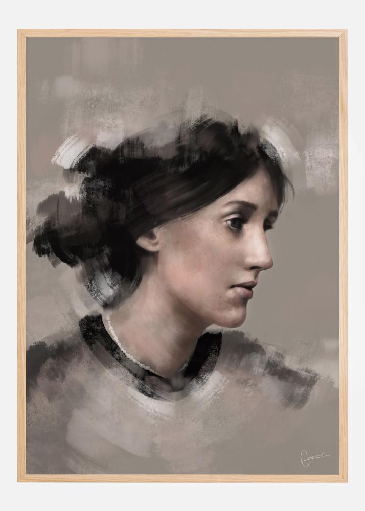 Een portret poster van Virginia Woolf in profiel. Haar haren zijn eenvoudige zachte klodders verf, maar haar gezicht is zorgvuldig gedetailleerd weergegeven. Het portret is zacht en vrouwelijk en geeft een bijna melancholieke toon aan haar gezicht als ze in de verte kijkt.
