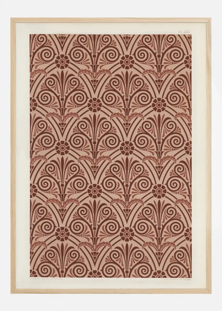 Een poster met een helder patroon van rode herhalende patronen. Binnen de patronen zijn krullende cirkels die lijken op bladeren. Er zijn ook bloemvormen, waardoor deze poster een botanisch patroon vormt. Perfect voor het maken van behangpapier. Kijk welke beelden je ziet in deze ingewikkelde patronen.