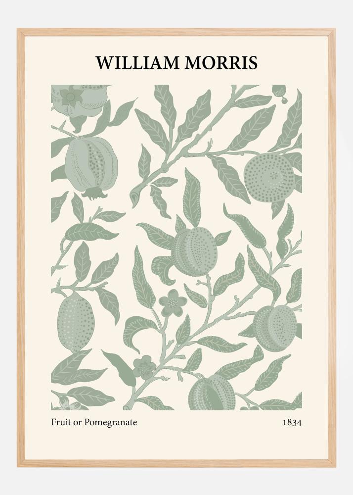 Deze onderscheidende William Morris-affiche, genaamd "Fruit of Granaatappel", trekt de aandacht van de kijker met zijn zorgvuldig gerangschikt patroon van fruit en gebladerte. Het kunstwerk komt zowel verfrissend als tijdloos over, met zijn kleurenpalet in rustgevende groene tinten tegen een zachte crèmekleurige achtergrond. De unieke vorm en structuur van de granaatappels worden geaccentueerd door contrasterende donkerdere groene bladeren, wat zorgt voor een aangenaam ritme en visuele diepte in het ontwerp. Dit is een poster die een sterke band met de natuur en haar rijke schoonheid draagt.