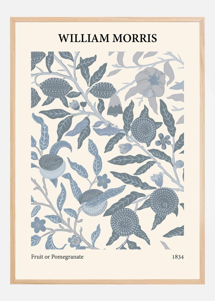 Deze gedetailleerde en stijlvolle affiche toont William Morris' iconische ontwerp "Fruit of Granaatappel", dat hier wordt afgebeeld met een verfrissende en elegante kleuring. De verfijnde compositie van granaatappels gemengd met verschillende bladvormen en bloemen geeft een gevoel van een levendige en bloeiende natuur. Het discrete kleurenpalet van de poster, met tinten blauw en grijs tegen een romige achtergrond, geeft een verfijnde en eigentijdse indruk die perfect past in een verscheidenheid aan interieurstijlen.