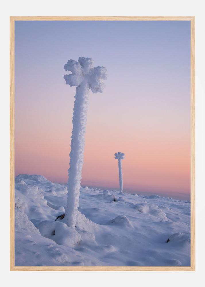 Deze poster toont een dromerig winterlandschap waar met sneeuw bedekte formaties oprijzen uit een zacht, golvend sneeuwveld. Het motief straalt rust en minimalisme uit, met met rijp bedekte pilaren die bijna op sculpturen in de natuur lijken. De lucht heeft een prachtige kleurovergang die het beeld een kalme en poëtische uitstraling geeft – perfect als print of affiche voor wie een harmonisch en modern gevoel in huis wil creëren.