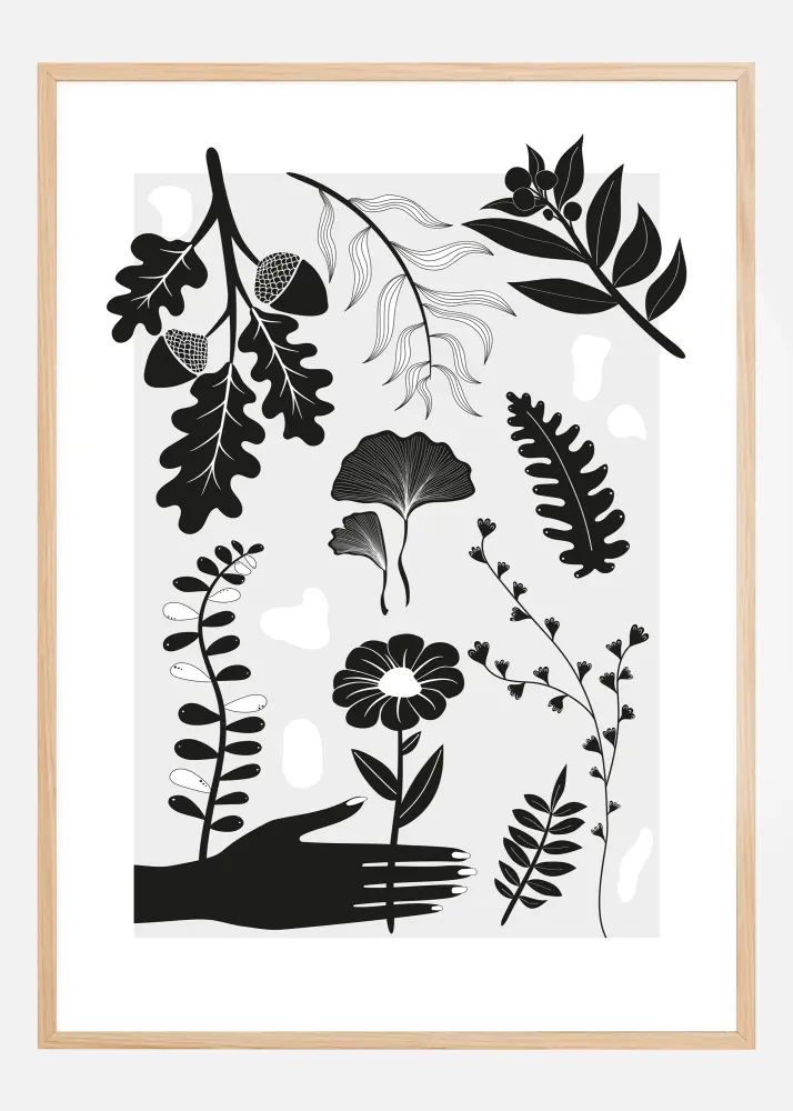 Een gedurfde poster met zwart-wit motieven van verschillende bladeren, planten en bloemen. Een zwarte hand reikt uit om een van de gestileerde bloemen te grijpen. Eikels, bloemen, varens en meer vullen deze eenvoudige maar interessante poster. Breng jezelf in een botanische stemming met deze planten poster in je huis.