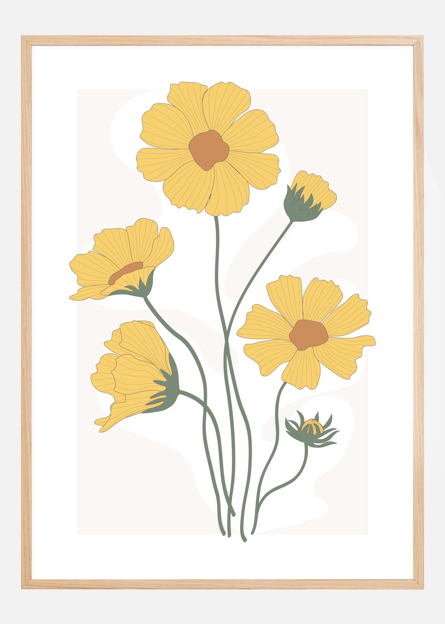 Een poster van gele goudsbloemen gemaakt in een leuke printstijl. Elk van de bloemen straalt tegen de witte achtergrond. Ondanks dat het een eenvoudig gestileerd ontwerp is, zijn de bloemen vrolijk en de perfecte manier om wakker te worden met een glimlach op je gezicht.