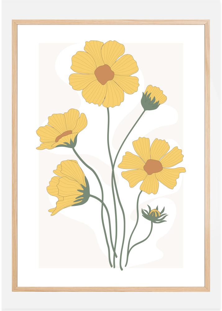 Een poster van gele goudsbloemen gemaakt in een leuke printstijl. Elk van de bloemen straalt tegen de witte achtergrond. Ondanks dat het een eenvoudig gestileerd ontwerp is, zijn de bloemen vrolijk en de perfecte manier om wakker te worden met een glimlach op je gezicht.
